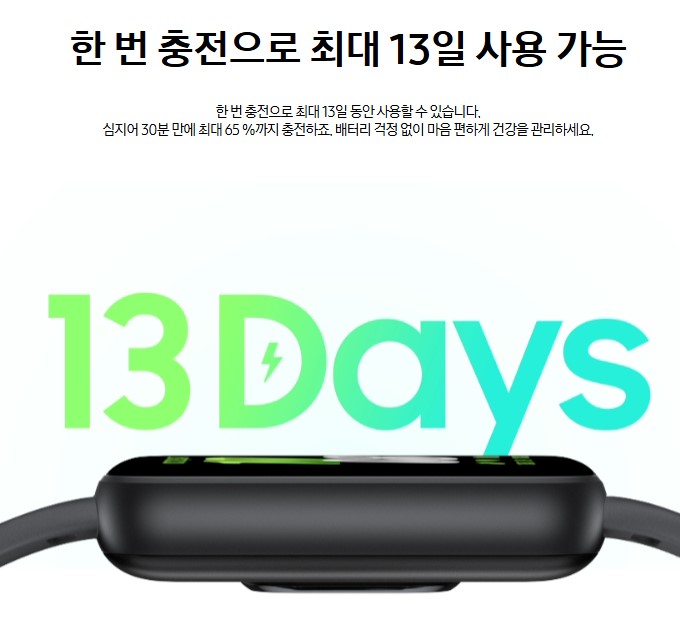 스마트 밴드에서 배터리 수명은 매우 중요한 요소입니다. 갤럭시 핏3는 뛰어난 배터리 성능으로 한 번 충전에 최대 10일 이상 사용할 수 있어 충전 걱정 없이 오래 사용할 수 있습니다. 장시간 여행이나 야외 활동 시에도 유용합니다. 또한, 충전 방식 역시 간편하게 설계되어 있습니다. 고속 충전을 지원하여 단 30분 충전으로 약 65%의 배터리를 채울 수 있으며 마그네틱 충전 크래들을 통해 빠르고 손쉽게 충전할 수 있어 편리함을 더했습니다.