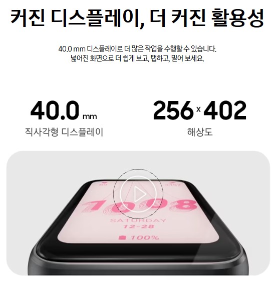 갤럭시 핏3는 기존의 좁고 긴 형태에서 벗어나 더 넓어진 직사각형 디스플레이로 이전 모델들과는 확연히 다른 디자인을 선보입니다. 디스플레이는 선명한 1.6인치 AMOLED 패널로 텍스트나 아이콘이 더욱 선명하게 보이며, 밝은 햇빛 아래에서도 정보를 쉽게 확인할 수 있도록 설계되었습니다. 화면 크기가 이전 모델보다 커졌기 때문에 터치 조작도 크게 향상되었습니다. 미니멀하면서도 정보확인에 훨씬 편리하게 출시되었습니다.