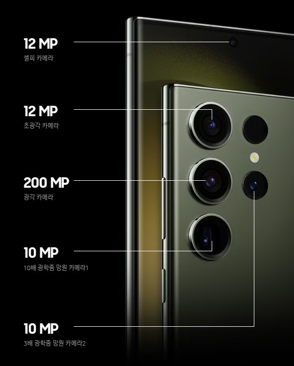 갤럭시 S23 울트라의 카메라 시스템은 여전히 강력합니다. 2억 화소 메인 카메라, 12MP 초광각, 10MP 3배 망원, 10MP 10배 망원 카메라로 구성되어 있어 다양한 상황에서 뛰어난 사진과 영상을 촬영할 수 있습니다. S24 울트라와 비교했을 때 가장 큰 차이는 망원렌즈입니다. S24 울트라는 50MP 5배 광학 줌 렌즈로 변경되어 중간거리 줌에서의 화질이 상승되었습니다. 사진을 자주 이용하는 상황에 따라 선택에 차이가 있을 수 있겠네요.